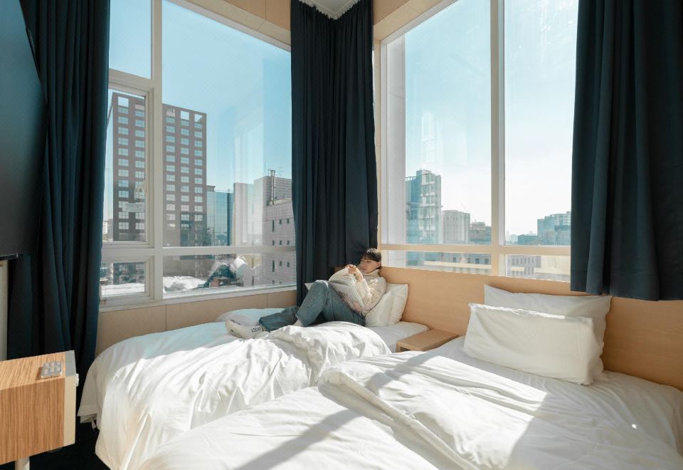 신촌/홍대역 인근, 주변 편의시설 👍. 좁은 객실과 아쉬운 방음은 단점.